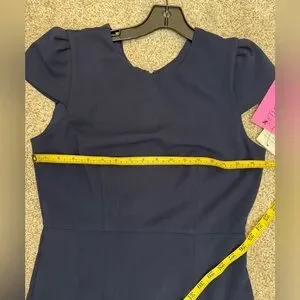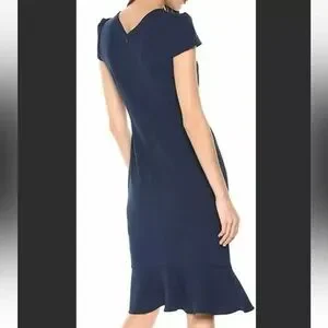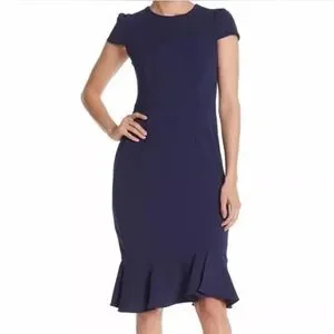 This beautiful Betsey Johnson dress is perfect for any occasion. The navy blue color and solid pattern make it a classic choice for a wedding, party, formal event, or even for workwear or business attire. The dress features a round neckline, cap sleeves, and a zip closure. Made of a comfortable and stretchy polyester and spandex knit fabric, this midi-length pencil dress is designed with a flattering ruffle accent. It is available in size 6 and is suitable for all seasons, including winter, summer, fall, and spring. Choose this dress to add a touch of elegance and style to your wardrobe.