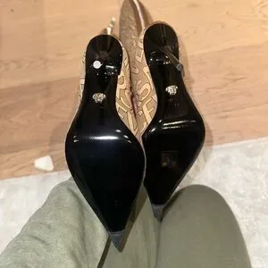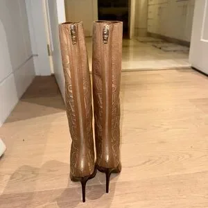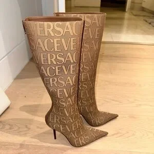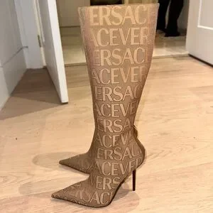 the Versace Allover knee-high boots bring iconic flair to your every day. The pair comes shaped with pointed toes and stiletto heels. GORGEOUS!! These are 38IT/8US and these do fit more like a 7US. That’s why I am selling they are too small for me. I am a true 8US. Never been worn! (No box)