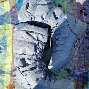 Two years old, lightly worn. Soft shell style. Insulation inside is puffy, very warm and cozy. See pictures for details... The outsole shows almost no wear.