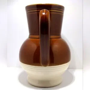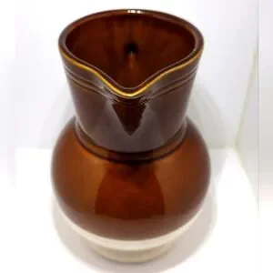 This 1L pitcher is crafted from high-fired clay using Emile Henry's unique manufacturing process. A caramel glaze protects against scratching or chipping, while the clay's thermal properties ensure drinks retain their temperature—hot or cold. Two toned design, carry handle, glazed finish. Made in France. 1 liter capacity.