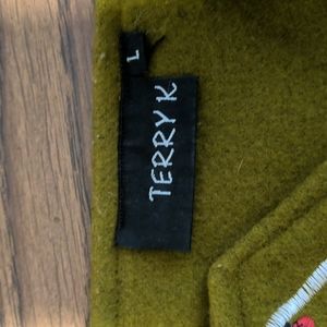 Vintage Terry K Floral Embroidered Wool Blend Coat in size Large. Basic approx measurements are pictured. Good pre-owned vintage condition with all marks I could find pictured - some faint dark spots and raised stitches. All are minor.