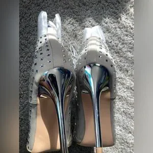 Light grey/tannish in color with aurora borealis rhinestones all over with a silver/mirror heel