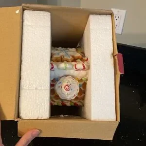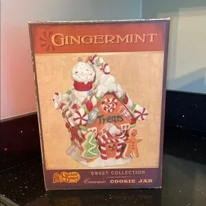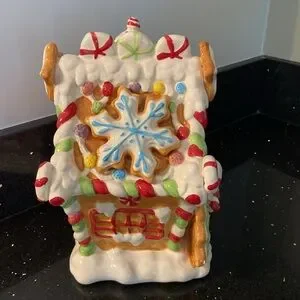 So festive for Christmas and the holidays. Adorable addition to or start your own gingerbread kitchen theme. This is a heavy 2-piece ceramic treat or cookie jar and it has candies and stars that are sculpted and a sweet cupcake for its chimney!