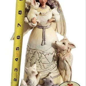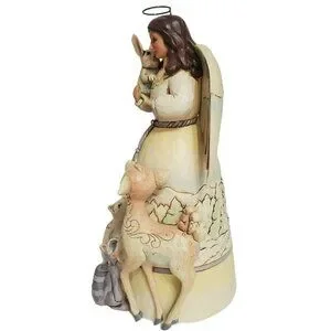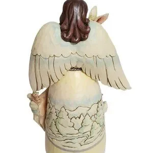 This beautiful Jim Shore figurine depicts a serene Christmas scene in the heart of a winter wonderland. The angelic figure stands at 9.5 inches tall, with intricate details and a wood carved look. The figurine features an with angel wings and halo, surrounded by woodland animals such as deer, fox, racoon, bunny and squirrel. Crafted from high-quality resin material, this Enesco Jim Shore figurine is a collectible and original piece from the Heartwood Creek collection. The traditional country folk art style adds to the charm of the figurine, making it a perfect addition to any Christmas holiday décor. The figurine comes in its original box and packing material, with features such as a winter scene of mountains and snow.