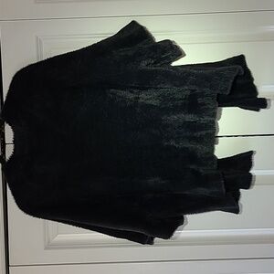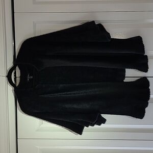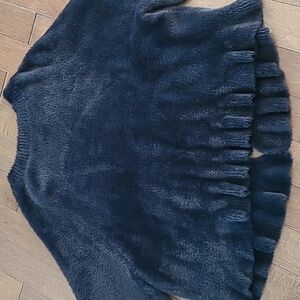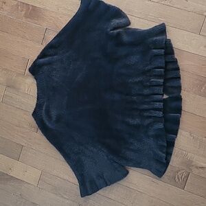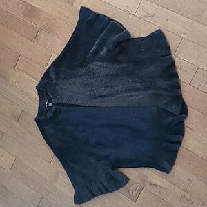 Tribal Brand Black chenille very soft and fuzzy like short hair fur that doesn't shed, sleeves are 3/4 flowy with 2.5" width ruffle at ends and this same ruffle is all along bottom hem, open Cardigan (no buttons or clasps). size is small petite, however fits up to XL because so flowy and loose. Very elegant piece, would be nice over satin silky dress for a chilly evening. 🌠🪄✨️