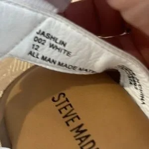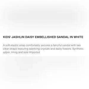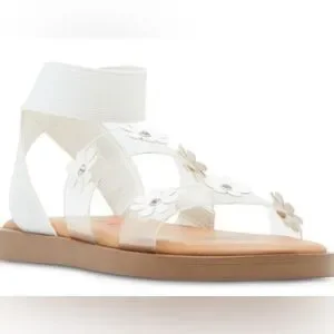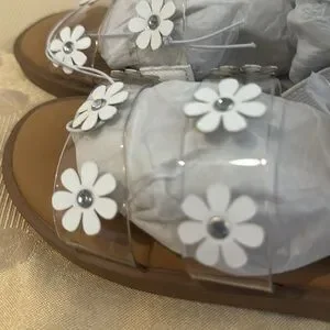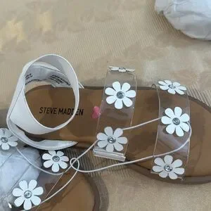 NWOT Steve Madden kids Jashlin sandal. White with clear straps. Cute daisy embellishment on straps. Slip on stretchy ankle strap. Girls size 12.