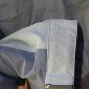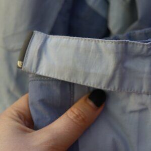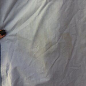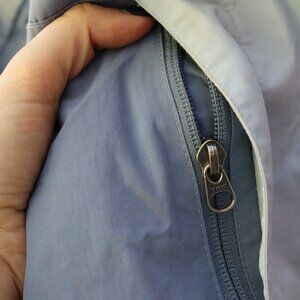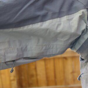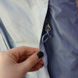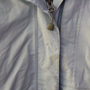 The North Face blue ski jacket with super warm fuax sherpa inner lining and collar. Many zippers and vent inner arm zipper opening. Stains throughout the front, back, and arms, missing pull on some zippers, see photos. Sold as is