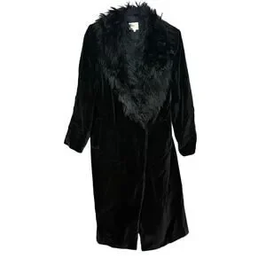 Oasis long black velvet coat faux fur collar British pockets button front US 6