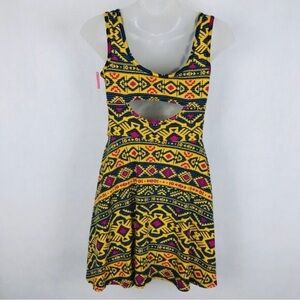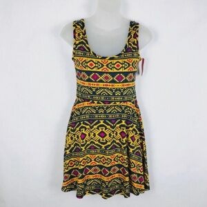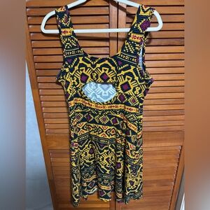 A sleeveless scoop neck dress in a vibrant black and yellow pattern, perfect for casual or resort wear. Cut out hole in back. Size large. Used once.