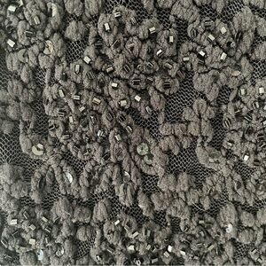 This is a lovely little black dress. The label looks vintage to me. Sleeveless with a pretty beaded top, zippered in the back. Falls to about knee length or slightly above.