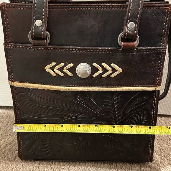 This unique handbag is crafted from high quality tooled leather. Featuring intricate floral design on front. A Buffalo nickel accent on front adds to a Western flare. Featuring double leather straps for a comfortable wear. The interior is lined with fabric along with a zipper pouch for storage.