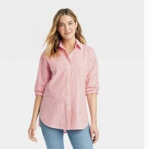 Women's Oversized Long Sleeve Collared Button-Down Shirt - Universal Thread Red Striped