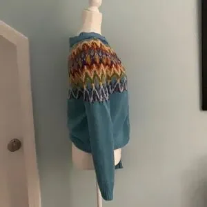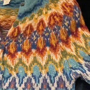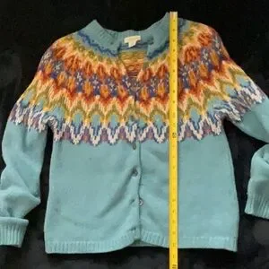 Turquoise is the main color in this quality sweater, accented with beautiful fall colors of gold, pumpkin, red, loden green, royal blue, cream and purple. Grosgrain ribbon lines button hole/button area. Handwash and lie flat. NOTE: the color is most accurate in the lay down photos than the mannequin photos.