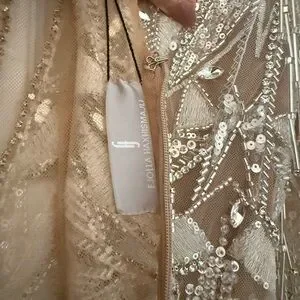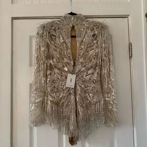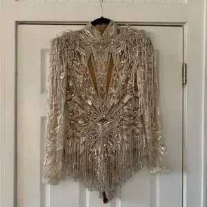 Body Suit with high neck and long sleeves, embroidered with stones and crystals of different shape/ sizes, and fringes detailed bottom.