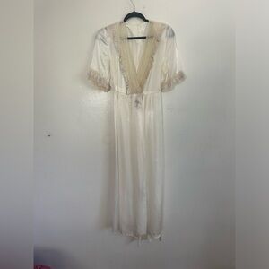 Absolutely stunning vintage 1930s robe. Can be worn as a robe or as a dress. Beautiful lace work on the neck and sleeves. Clasp enclosure. Some very tiny signs of wear, otherwise very great condition. This is a handmade piece. Can fit size small/medium.