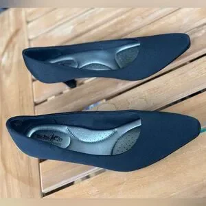 These heels are classic and professional. The heels are short and patent. The shoe material is knit and has some give to it for comfort. They also have built in cushions in the soles.