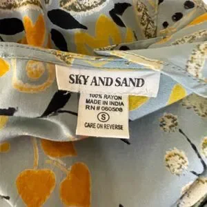 Keywords: Sky and Sand, flutter sleeve, tiered skirt, knee-length dress, multicolor, floral pattern, casual dress, spring fashion, split neck, matching belt, women's dress, pre-owned, EUC, rayon dress, hand wash.
