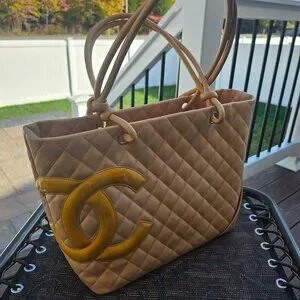 Chanel Cambon Line Large Shoulder Bag / Tote Bag Nude with Yellow C's. Neutral Quilted Lambskin Leather. Orange zippered interior with 2 zippered privacy pockets and a key fob and outside pocket. Like new pre-loved condition. Zero callouts. Comes from a pet free smoke-free home. Chanel dust bag included with a full price offer.
