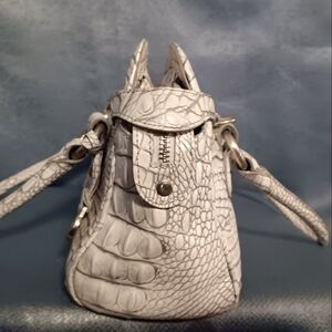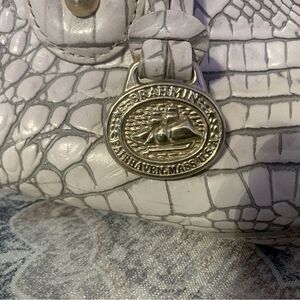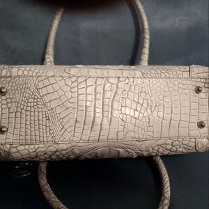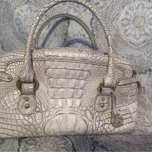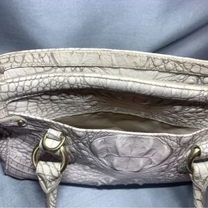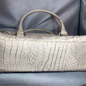 Brahmin Medium Ivory Satchel Bag, 4 bottom feet, 2 interior zip pockets, 2 interior slide in pockets, back slide in pocket and 2 rolled handles. Size: 13” L x 7” H x 4” W