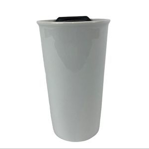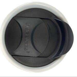 A ceramic travel mug with double wall construction and splash guard lid, for coffee on-the-go. Design inspired by Starbucks' iconic white paper cup. Design features the Starbucks logo on the front. Holds 10 fluid ounces. Handwash only. Do not microwave.