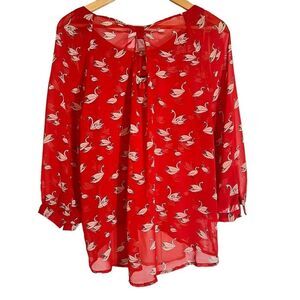 XXI Red Swan Sheer Summer Top Blouse 3/4 sleeve Large