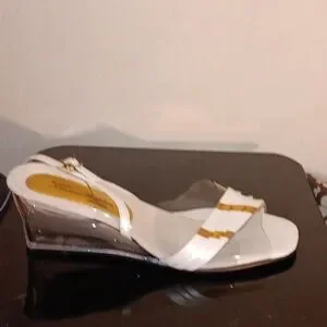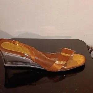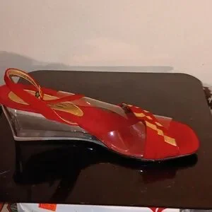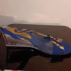You get 4 pairs of Size 8 Lucite 2" wedge heel sandals . Worn only a couple while on vacation. Navy blue, red, white, metallic copper all have gold accents with adjustable sling back strap . All 4 pairs for $19