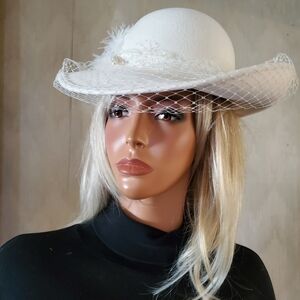Vintage Miss Bierner Winter White Wool Hat with Veil and Jeweled Feather Plume. 22" circumfrence. A lovely church hat. ladies tea or luncheon. Immaculate condition. Offers welcome.