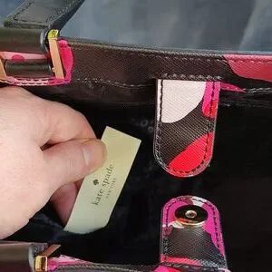 Preloved Kate Spade Grant Street Juno grainy vinyl Wonderfloral mini tote with black leather trim and handles. Magnetic snap closure. Great used condition. Minor scratches and normal wear to outside of bag and gold logo hardware. Preloved bag with signs of wear and use. May have odor from use or storage. Will use natural deodorizer spray before shipping but it may not remove odor completely. Handles and other hardware in pristine condition. Interior fabric lining with Kate Spade signature logo is clean and in pristine condition with no rips, stains or tears. Bottom and sides of bag in excellent condition. Tote measures approximately 10.5 inches long by 8 inches high and 5 inches wide. Double handle strap drop is approximately 5 inches. This is a small mini tote that is a shoulder or hand carry, not a crossbody. Beautiful bag but not my style. Comes from smoke free and cat friendly home. Feel free to make an offer!