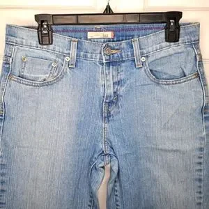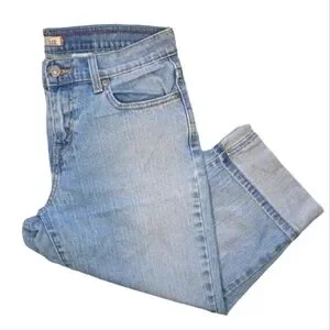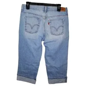 Very good condition capris from Levi's. Lighter wash, cuffed hems, "515" style. Size 8; measures about 15.5 inches across the waist, 9.5 inch rise and 19 inch inseam.