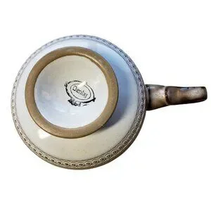 Lovely vintage Denby Seville stoneware gravy boat is in excellent used condition - no chips, cracks, or noticeable crazing. Has handle and pouring spout. Tan and white with beading around edge. Produced in Staffordshire England. B1
