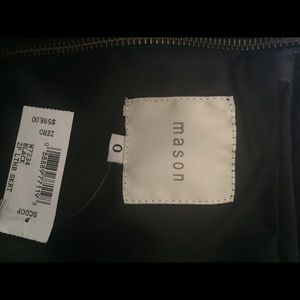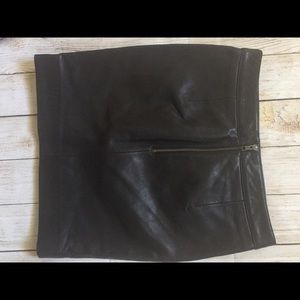Michelle Mason mini leather skirt with wrap front detail. Asymmetrical hemline with a back zip closure. Fully lined. 100% leather; dry clean only. The length from the waist to the headline is about 15 inches. The first picture is a cover shot not the real skirt just to show you what it looks like on. Nice pre owned condition