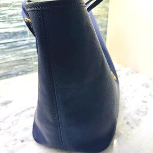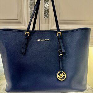 Impossible!@! What a bargain!@!@ Michael Kors Saffiano Navy blue large tote~ dimensions: 19"'s Wide X 11"'s High X 7"'s Deep ~ Versitle large enough for travel tote ~ soft and unstructured ~ two insided pockets, one is zippered ~ interior key fob attachment~ clasp closure to hold top of tote sides together ~ great condfition gently worn ~ no signs of wear