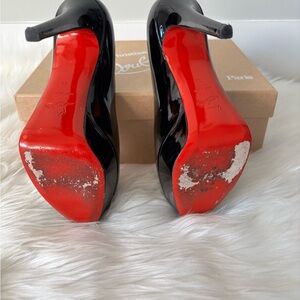 These stunning pumps are crafted of shiny patent leather in black. These feature a wrapped sharp 5.25-inch stiletto and a covered platform of an 1.25-inch and a round toe. Excellent condition worn twice. Comes with box and shoe duster bag