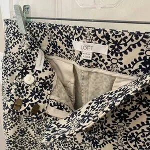 Like new, no stains, holes, or signs of wear. Womens size 4 from Loft. Colors are cream and black. Cropped style pant with 4 pockets and double hook and button closure. Slight split hem at ankle. Mid rise. 99% cotton, 1% spandex. Machine wash cold.