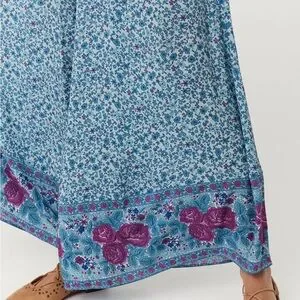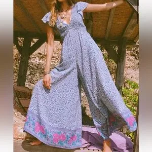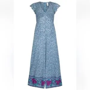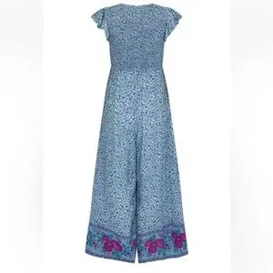 Embrace easy elegance with the Love Jetty Shirred Jumpsuit in Blue Nirvana, designed for both comfort and style. Slip in to this baby with ease with a hidden centre back zipper which with the shirred bodice offers a flattering tailored fit. Flirty flutter sleeves add a playful charm while the dramatic full length wide leg offers an air of sophistication. Featuring an all over ditsy daisy hand drawn print in cornflower blues and a striking rambling rose border detail in deep magentas, this jumpsuit offers dreamy romance for the modern muse. Whether you're exploring cobbled streets and vintage markets or long lunching with loved ones, this jumpsuit is an instant favourite for any occasion, simply adjust your accessories to elevate or relax this versatile new style.