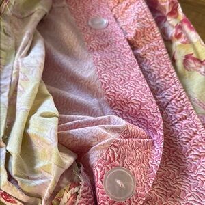This vibrant custom duvet features a feminine floral pattern in soft green and various shades of pink, with large-scale blooms resembling peonies or roses. Size is Full.
