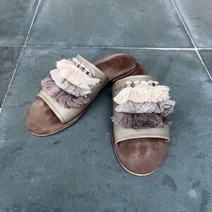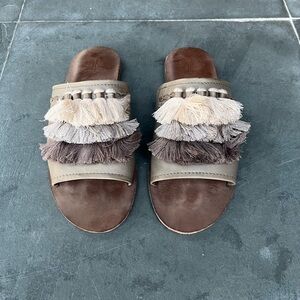 Frye Riley Gray Tassel Fringe Leather Sole Slides; style and comfort!