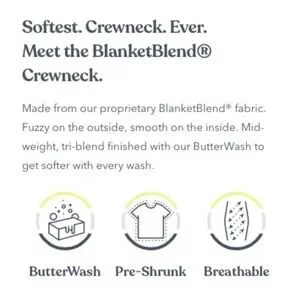 Softest. Crewneck. Ever. Meet the BlanketBlend Crewneck. Made from a proprietary BlanketBlend fabric. Fuzzy on the outside, smooth on the inside. Mid-weight, tri-blend finished with Feat's ButterWash to get softer with every wash. The custom developed BlanketBlend fabric combines the comfort of cotton, with the performance features of polyester finished off with a rare yarn & ButterWash process to create a super soft, durable crewneck for every occasion.