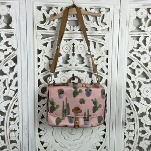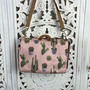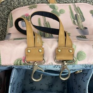 Twelve Little On-the-Go stroller caddy diaper bag with blush color and cactus print. Adjustable strap, wipes dispenser pocket, two sections inside with three more pockets. The top flap has zipper access. The stroller straps still work but the clips are loose. I bought another set on Amazon that I use on our stroller. GUC with normal wear, but we didn't use it a ton. There is some dusting around the edges of the bag and the bottom, some light rubs but no stains or tears. Dimensions: 13"x9"x6" Smoke free and dog friendly home.