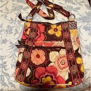 Vera Bradley crossbody bag. Well used; some discoloration back of bag (see big cream color flower on back of bag)-probably from rubbing. Still excellent bag! Moving so needing to downsize!