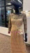 This is a Rickie Freemen gown, Teri Jon, size 6. It’s gold with sequins with a bow at the waist. The gown has 3/4 sleeves, is lined and has a slit in the back.