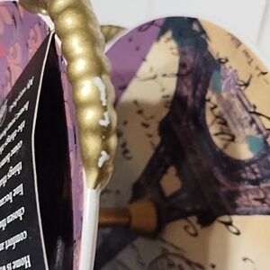 Plates have images of Paris and bicycles. Purple, White,Light Blue and Black coloring.