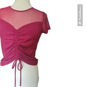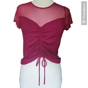 CRAVE FAME Juniors' Red Mesh Illusion Ruched Top. Size XL. Lightly used and in great condition, over all. two small faint spots, discoloration spots (last 2 photos).