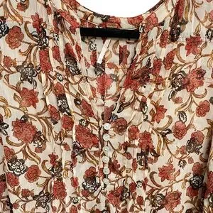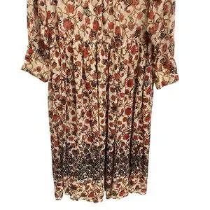 Features a feminine floral print, long sleeves, button-front neckline, relaxed fit with a dropped waist, pleating down the skirt and pockets on either side. Semi-sheer fabrication and a pull-on style. 100% polyester. Interior lining was removed (any dress can be worn underneath) otherwise in excellent preowned condition, no flaws.