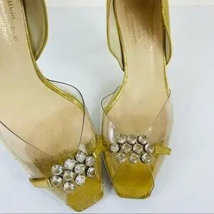Gold and clear Leather Swarovski jeweled peep square toe D'Orsay heels shoes. Size 7.5