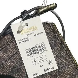 Michael Michael Kors Camden Signature XS Pouchette Crossbody in Brown/Black. New with tags. Gold tone hardware. Adjustable crossbody strap. Top zip closure. One exterior pocket with magnetic closure. One interior slip pocket. Pink signature lining. Measures 5” x 10”.