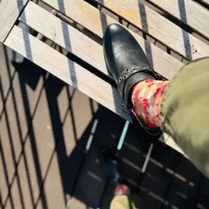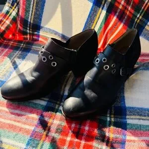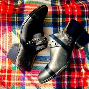 Funky black real leather booties with tapered toe shape. Zip enclosure from the side. Approximately 2” wooden heel with animal hide accent. Top leather strap accent with buckle and grommets. A unique style but also versatile and edgy. Medium to narrow width. Fair offers will be accepted. Looking to clear quickly.