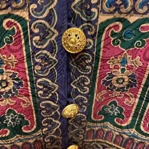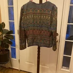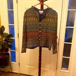 Beautiful colors adorn this 100% silk 90’s vintage blazer. Fully lined and long sleeve but lightweight for those cool evenings. 5 gold button closure. Measurements are taken lying flat non-stretched