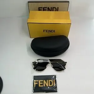 Fendi FF Match aviator sunglasses comes with cleaning cloth. comes in a case, comes with a presentation box . Lens filter category 3. Frame color: gold. Frame material: metal. Lens color: grey. Lens type: tinted lenses. Made in Italy.
