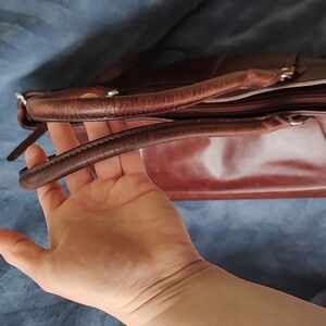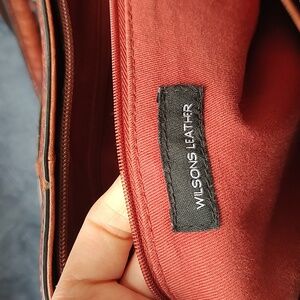 Wilson's Leather brown cognac large briefcase crossbody bag. Silver hardware. Soft Leather. Semi structured bag. Leather and metal chain removable and non adjustable crossbody strap. Orange/rust red fabric lining. Protective metal feet on bottom of bag. Good used condition. Bag measures approximately 18 inches long by 10 inches high and 4 inches wide. Rolled double handles measure approximately 9 inches and crossbody strap measures approximately 23 inches. Normal wear to exterior leather. Rolled double handles show heavier signs of use. Interior is clean with a couple of minor spots on lining in large main section of bag. Small white spot that looks to be paint inside zippered pocket on outside of bag. Main compartment has one zippered pocket and two open slip pockets. Bag is in pre loved condition with lots of life left. Thick, sturdy, distressed leather. Very faint storage odor. Can fit a light weight sweater along with essentials. Accepting reasonable offers!